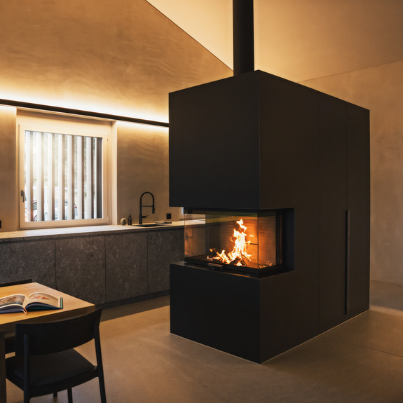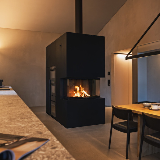 Au lieu d'être placée dans une niche latérale comme c'était le cas jusqu'à présent, la cheminée a été placée sur un socle surélevé au centre de la pièce à vivre. Elle attire ainsi le regard et confère à la pièce un caractère unique.