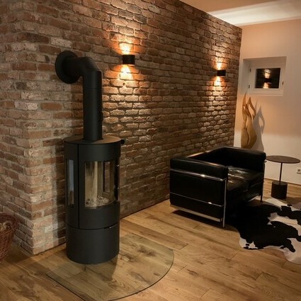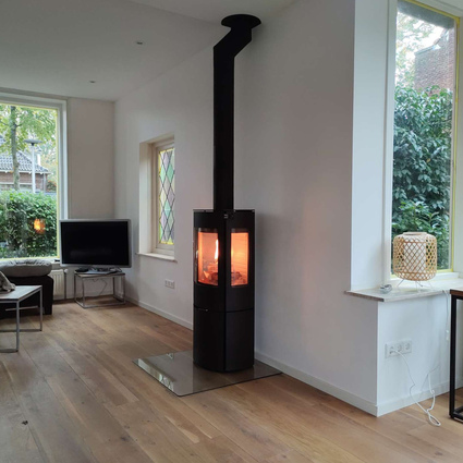 Poêle à bois CARO 110 en noir avec porte de foyer plein verre et vitre latérale dans un salon